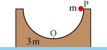 如 圖1所示,一個小球,靜置於半徑為R的半圓弧木塊頂端 (P點),放手後,小球滑至木塊底部 (O點) 時,速率為V 0 (相對於地面)。已知小球質量為m,弧形木塊質量為3m。假設木塊與小球間,木塊與地板間,均為光滑無摩擦(小球只有滑動,不會滾動)。則