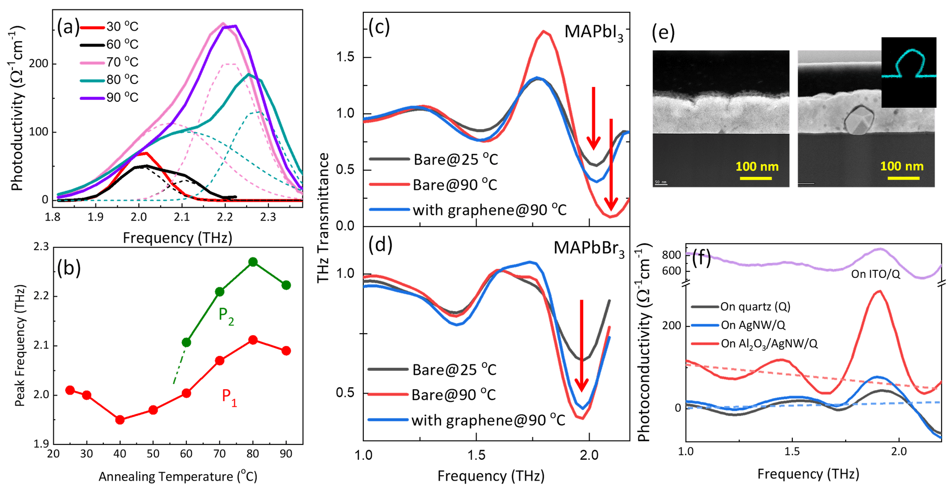 圖6、(a) ~2 THz共振聲子模態的光導率(photoconductivity)頻譜與峰值擬合曲線。(b)分離峰值於不同退火溫度的頻率位移。(c)(d) 分別為MAPbI3與MAPbBr3在有、無石墨烯覆蓋層下於25 和 90 ℃的THz穿透率。(e) MAPbI3/AgNW 和 MAPbI3在石英基板上的橫截面(Cross-sectional)TEM影像,插圖為鋁(Al)元素的X射線能量色散光譜(energy-dispersive spectroscopy mapping,EDS mapping)。(f) MAPbI3於石英、AgNW及AgNW上的光導率頻譜,以及AgNW於導體氧化物―銦 錫氧化物上的光導率頻譜。