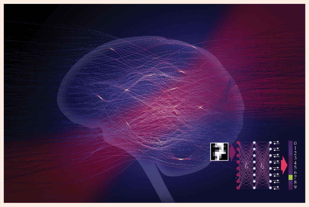 圖一.受大腦的啟發,人工神經網絡透過在多層節點(神經元)之間傳遞訊息來處理資訊。在此過程中,會有可訓練參數的矩陣(如插圖中標示的 J1 和 J2),這些參數經過來回調整,以最佳化網絡執行特定任務。在本圖中,任務內容是辨識數字圖像。(圖片由克萊拉·萬朱拉提供;插圖改編自參考資料1。)