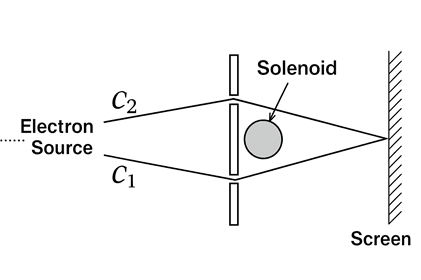 驗證此效應的實驗設置是電子雙狹縫干涉,在兩個對稱路徑 $C_1$ (下方) 和 $C_2$ (上方) 之間放置一個磁螺線管,而磁場封閉在管中。當電子在無磁場區域通過時,兩個路徑上的波函數分別是 $\psi_1=e^{-iqf_1 /\hbar} \psi_0$ 與 $\psi_2=e^{-iqf_2 /\hbar} \psi_0$,它們的疊加給出的總波函數為
