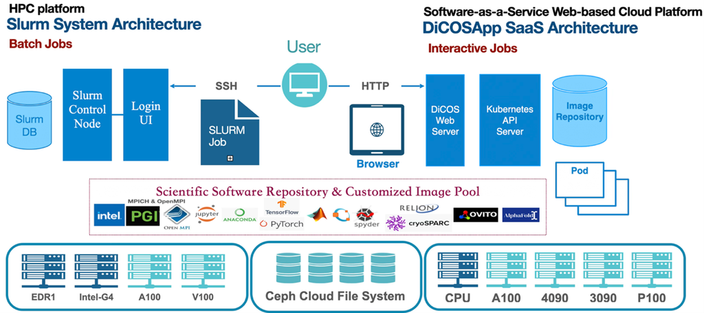提供使用者便利的 Slurm 及 Web-based 雲端計算(Software-as-a-Service, SaaS)服務介面,利用本中心各類 CPU 或 GPU 資源,高效能的完成所需資料處理與分析計算。同時支援機器學習或需要的科學計算軟體與環境,包含客製化建立 Web Application, JupyterLab 應用環境,容器化(containerization, 使用 Singularity,提供獨立、可攜性以及安全的)軟體環境建置。目前可用的 SaaS DiCOS App 服務,已超過 70 項。各項已建置可使用的軟體環境與工具,請參閱本核心資源網站。本計劃同時支援大數據分析的流程整合與最佳化,支援與研究設施間的整合,促進大數據分析流程與效能最佳化。