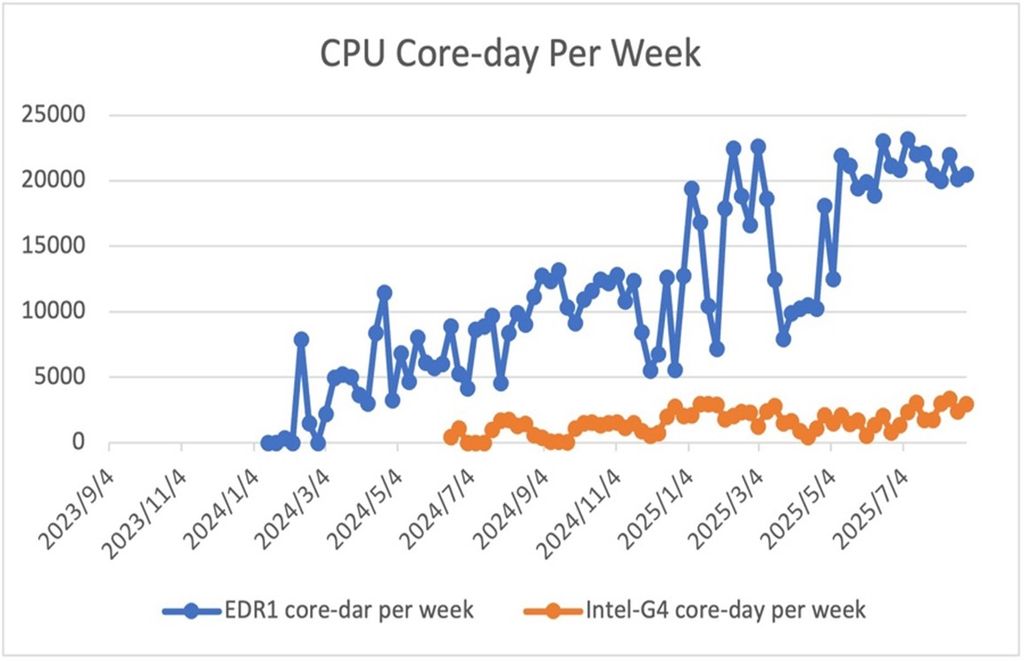 目前,NSTCCore 高效能核心科學計算中心為全台各研究機構與大學提供服務,支援超過 140 個研究團隊,涵蓋約 600 名使用者。這些研究團隊從事許多不同的研究主題,包括天體物理學、生物醫學、化學、氣候研究、地球科學、資訊科技、數學、微生物學、粒子物理學以及太空科學。過去十八個月中,我們的 CPU 資源使用量持續穩定增加(如圖三所示),每週達到約 25,000 個 CPU core-day。GPU 資源的使用量也穩步成長,在過去六個月內總計達到 17,000 個 GPU board-day 。藉由本計算中心的運算資源,研究團隊已取得多項卓越成果,部分成果列示如下。