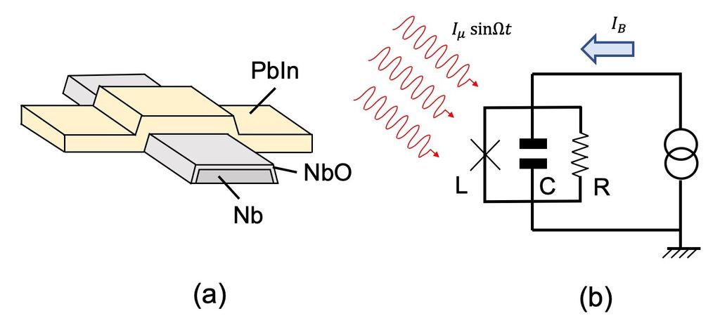 圖一 (a) 約瑟芬接面的微觀結構。該元件採用了由 鈮(Nb)與鉛銦合金(PbIn)構成的雙超導電極,兩者之間夾有一層極薄的氧化鈮(NbO) 絕緣層 (b)樣品的等效電路模型。為了精確控制接面的量子態,電路中設計了兩個關鍵電流源:I_B\ 為外加偏置電流,I_{\mu w}表示微波照射的影響。[1]