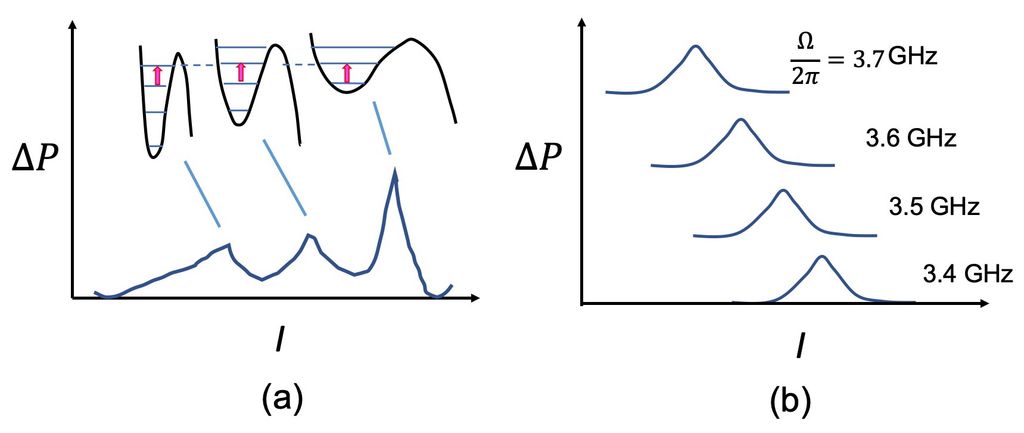 馬丁尼茲的實驗結果,可以透過兩大關鍵物理原理來完美解釋。不同於一般的收音機電路具有固定共振頻率,約瑟芬接面展現了極強的非線性 (Nonlinear) 特性。根據約瑟芬效應,接面的等效電感並非定值。當偏壓電流 $I_B$ 增加時,接面的物理狀態會發生變化,導致等效電感隨之改變。隨著電流增加,系統的有效電感會增大,導致 RLC 電路的共振頻率 $\omega$ 隨之降低。實驗觀察到,當調整電流使電壓出現時,該點對應的理論計算共振頻率,恰好與外加的微波頻率完全吻合。這證明了電路確實發生了共振吸收。