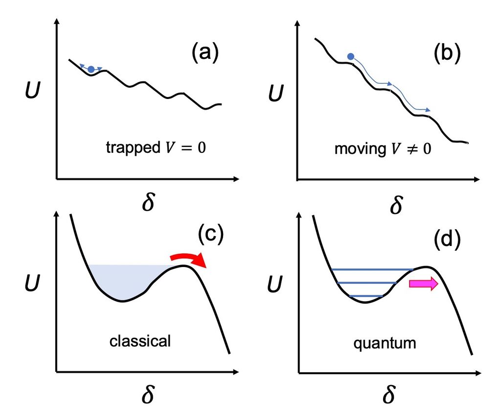 圖三 約瑟芬接面的物理狀態可以被完美類比為一顆在碗中運動的小球,而電路中的電流大小,則直接決定了這個碗的傾斜程度。(a)「止」的狀態:當外加電流較小時,碗的坡度平緩。小球(相位 \delta)被穩穩地束縛在碗底震盪,此時電路不產生電壓,表現出完美的超導特性。(b) 「行」的狀態:隨著電流增加,碗的傾斜度隨之劇增。一旦坡度陡峭到讓小球滾出碗緣,相位 \delta就會沿著斜坡持續滑行。這種相位的連續變化在電路中表現為電壓的產生。(c) 在古典力學的視角下,若小球的能量低於碗緣的高度(能量障壁),它就絕對無法逃脫陷阱。(d) 在量子系統中,即便小球的能量不足以「翻牆」,它仍有一定的機率透過「量子穿隧」,直接穿透能量障壁逃脫陷阱。[2]