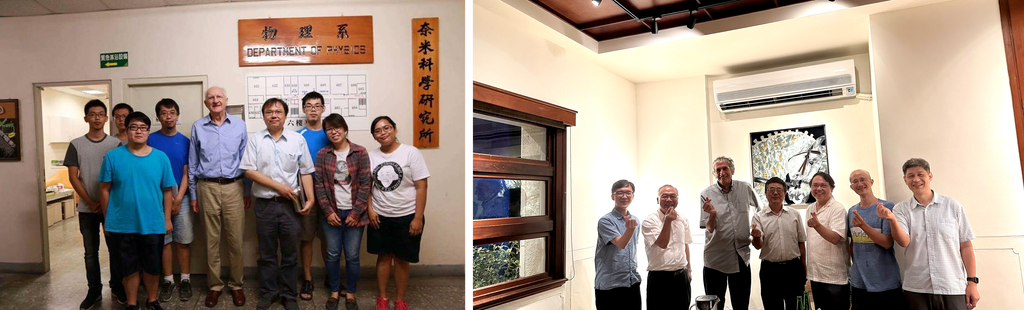 圖四 (左) 2016 年克拉克教授(Prof. John Clarke)蒞臨訪問中興大學物理系及本研究室。當時圍繞在大師身旁合影的青澀學子,如今已有四位陸續取得物理學博士學位,在各自的研發領域中發光發熱。這張照片成為科學火炬代代相傳的縮影。(右) 2023 年馬丁尼茲教授(Prof. John Martinis)受邀訪問中興大學,並參與量子科學與技術(QST)研討會。訪問期間,馬丁尼茲教授與中興大學詹富智校長及多位師長展開深度對談。這張照片呈現了台灣積極連結世界、躋身全球頂尖行列的企圖心。