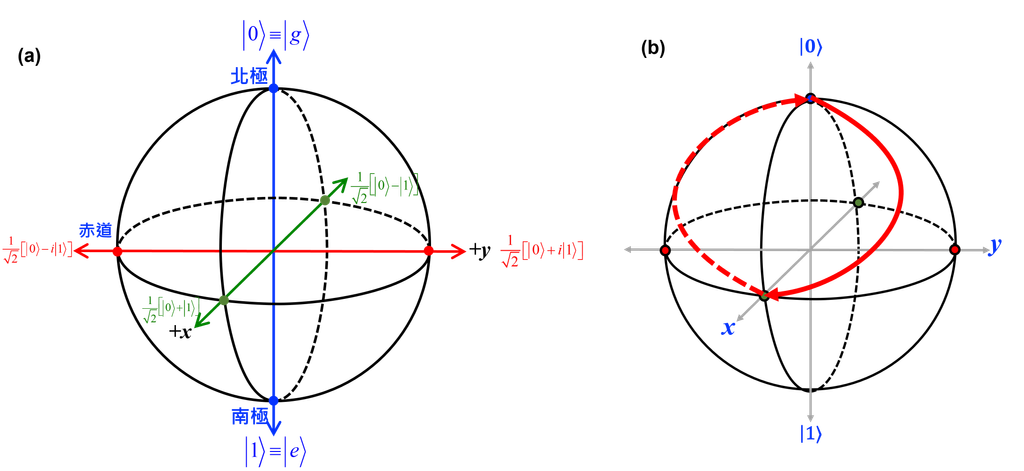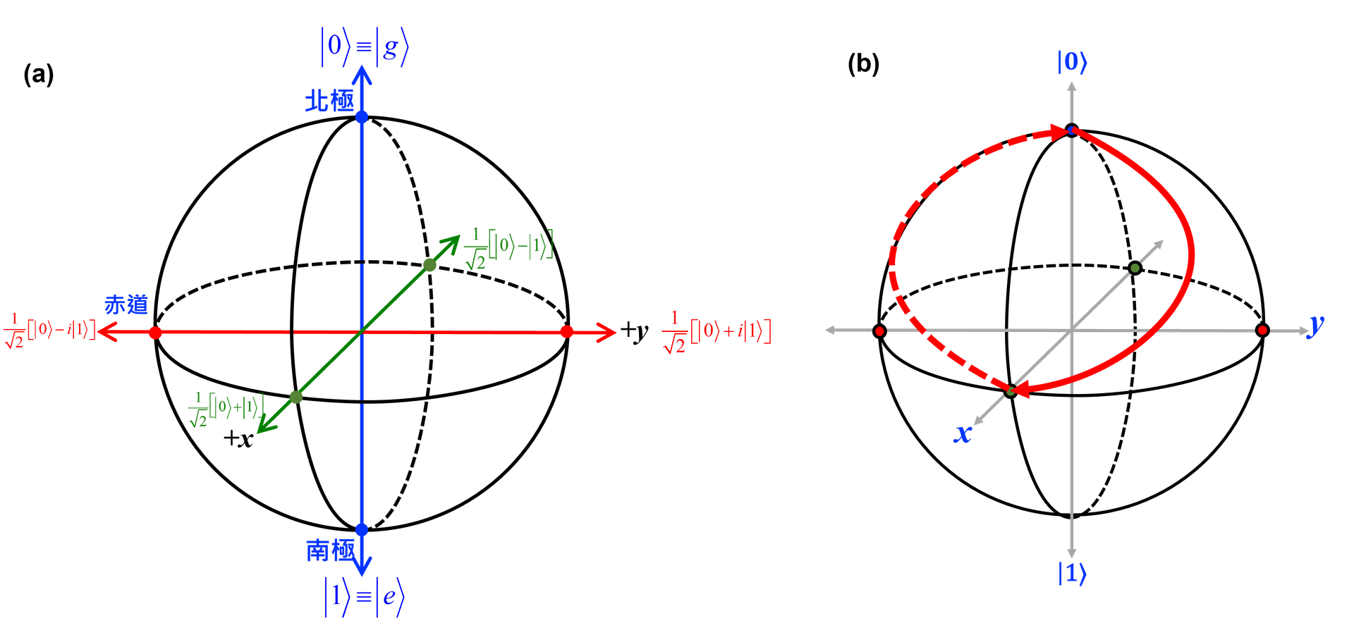 圖四、(a) 以立體球表現 $|0\rangle$ 與 $|1\rangle$ 的組合,如果把這球想成是地球,那我們可以定義北極為 $|0\rangle$,而南極為 $|1\rangle$。位於赤道上的都是 $|0\rangle$ 與 $|1\rangle$ 機率各半的重疊態,而操作上我們定義東西南北為相位差 90° 的四種重疊態。(b) 產生重疊態的最基本邏輯閘稱為 Hadamard 閘,重複實施 Hadamard 閘可以於 $|0\rangle$ 與 $|1\rangle$ 與重疊態做任意變換,以紅色實線與點線表示。