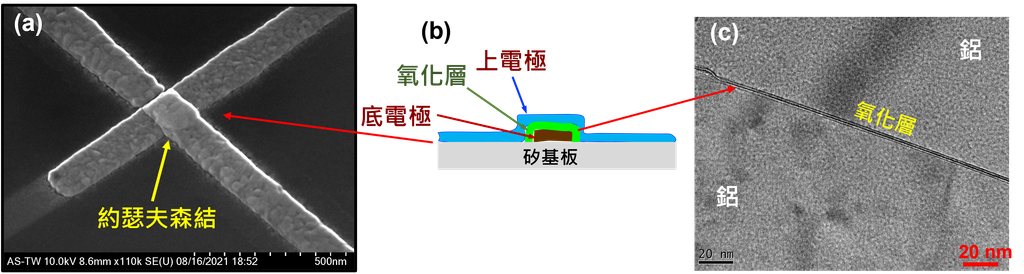 圖一、一個約瑟夫森結的結構: (a) 製作在矽基板上的約瑟夫森結的電子顯微鏡相片。十字型兩條鋁線的交叉點為上下層立體結構。(b) 切面結構示意圖,中間綠色的部分為氧化鋁。(c) 穿透式電子顯微鏡相片顯示夾在兩層鋁中間極薄的氧化鋁層。(相片來源:中研院量子電腦專題中心)