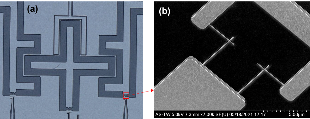 圖三、超導量子晶片的部分照片:(a) 製作在矽基板上的一個量子位元以及其兩邊的耦合位元,量子位元與耦合位元都是單邊接地的形式,所有的金屬材料都是鋁。中間十字型結構及兩邊倒F結構分別是量子位元及耦合位元的電容板。(b) 在電容板與地之間就是兩個並聯起來,十字型結構的約瑟夫森結。(a)與(b)相片不是同一元件,因而細微結構稍有不同。(相片來源:中研院量子電腦專題中心)