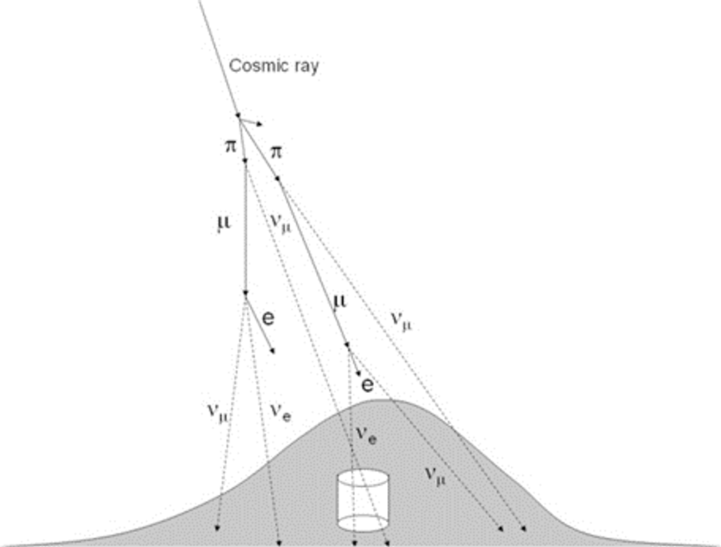 圖 1-1:以緲子 ($\mu$) 為主的宇宙射線,是大氣微中子的主要探測來源。圖源:Takaaki Kajita in the Proceedings of the Japan Academy, Series B, Physical and Biological Sciences (10.2183/pjab.86.303)