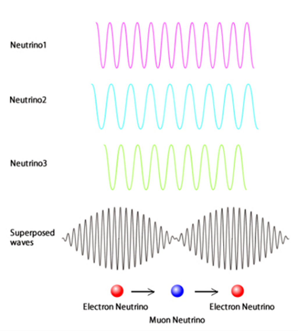 這裡 $\theta$ 代表混合角,$m$、$L$ 與 $E$ 分別代表微中子的質量、傳播距離以及能量。那麼,微中子振盪又如何佐證了微中子「質量非零」的事實?我們不妨換個角度思考:如果微中子質量為零,三種微中子將自然而然滿足 $m_1 = m_2 = m_3 = 0$,而這也正是標準模型原先的假設。然而,實驗率先觀測到了微中子振盪——而振盪的存在,意味著不同質量特徵態發生相位疊加,這只有在質量平方差 ($\Delta m^2$) 非零的情況下才可能發生(留意式(2)的質量項)。換言之,至少必須存在某些不相等的質量特徵態,例如 $m_1 \neq m_2$(不論第三個質量為何),這便直接導致一個不可避免的結論:至少有一種微中子質量不為零。僅憑這一點,就已足以打破標準模型既有的框架。至於標準模型為何會有「微中子質量為零」的設定,我們已在前文討論過,這裡不再贅述。