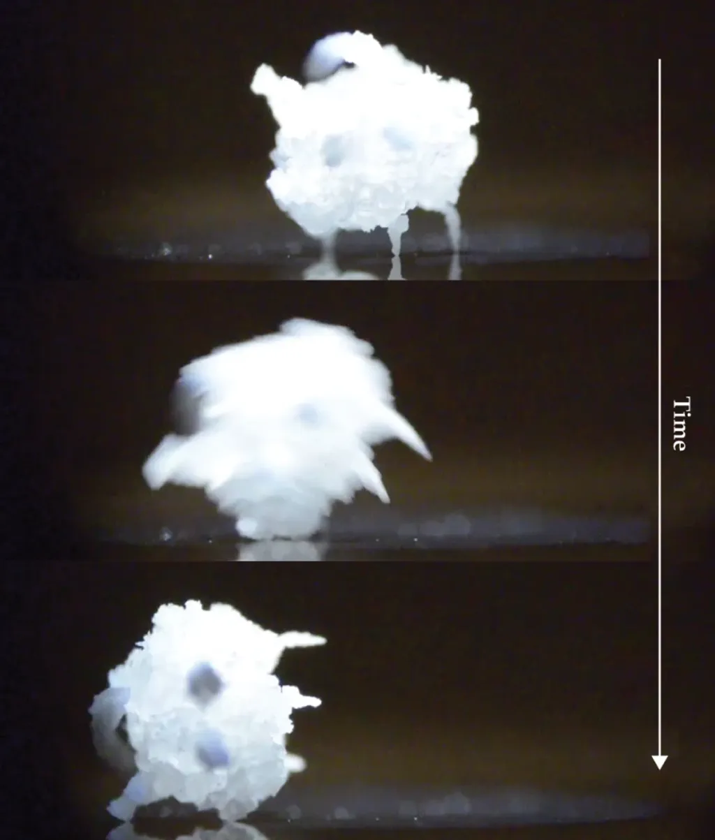 當瓦拉納西團隊正在研究這種界面塗層時,注意到了一種不尋常的行為:結垢從材料上脫落。晶體如預期由蒸發的水滴形成,但當材料加熱至50°C以上時,這些晶體會從塗層中自行脫離。高而細長的結構生成,並將鹽晶體結構向上推離表面。它們與水母(見圖1)和其他生物的相似性,加上它們詭異又類生命的生長方式,我們因此將這些構造取名為「鹽晶異怪(crystal critters)」。